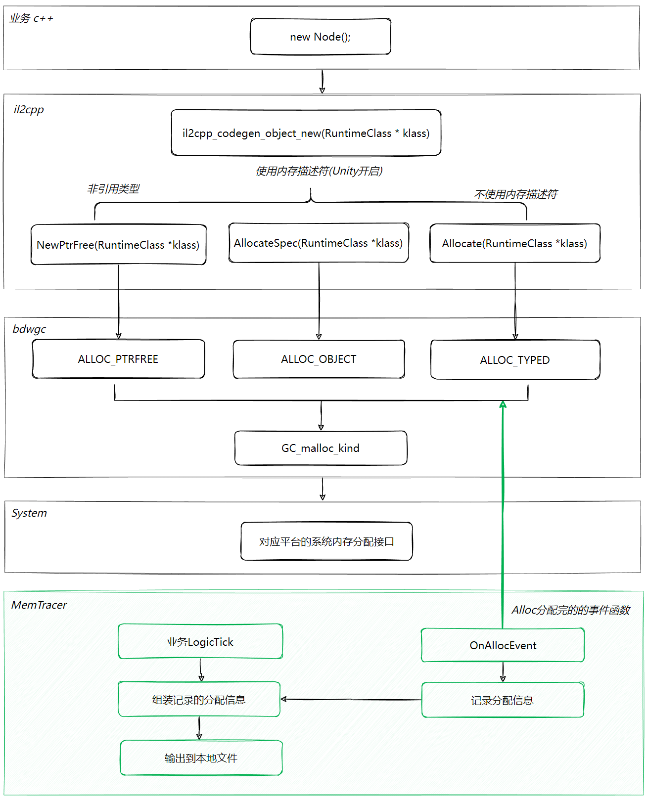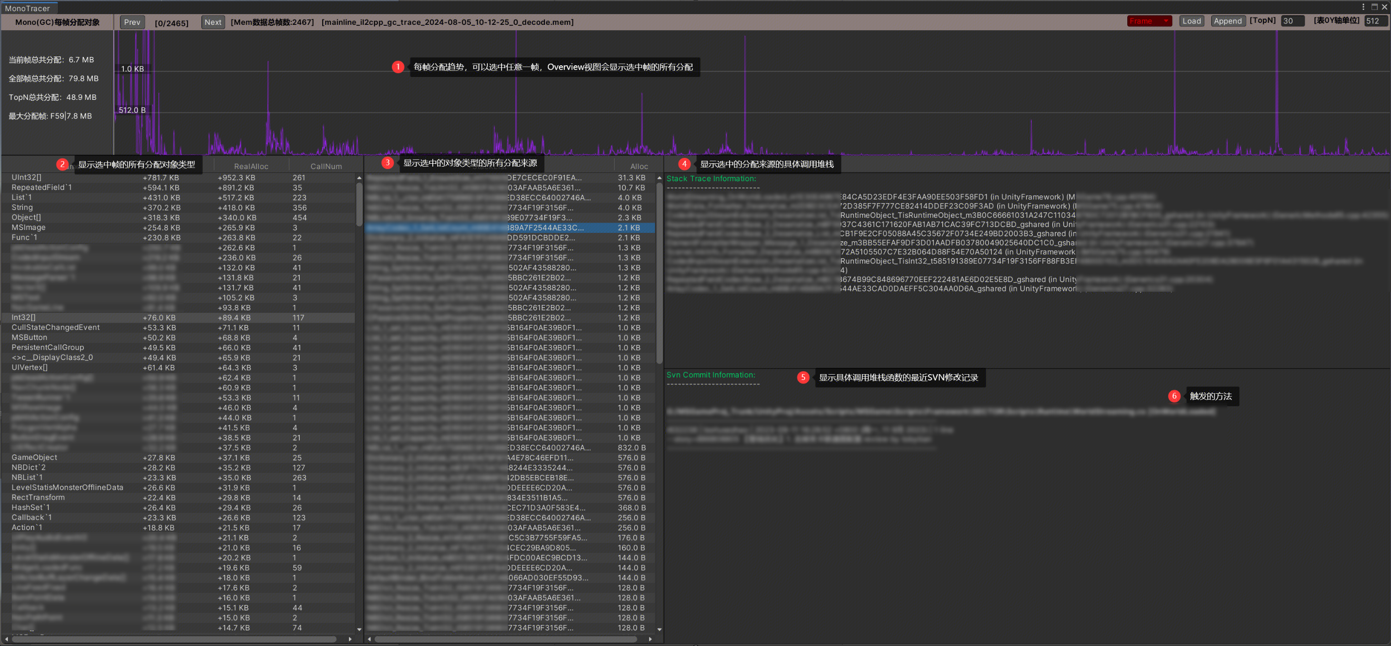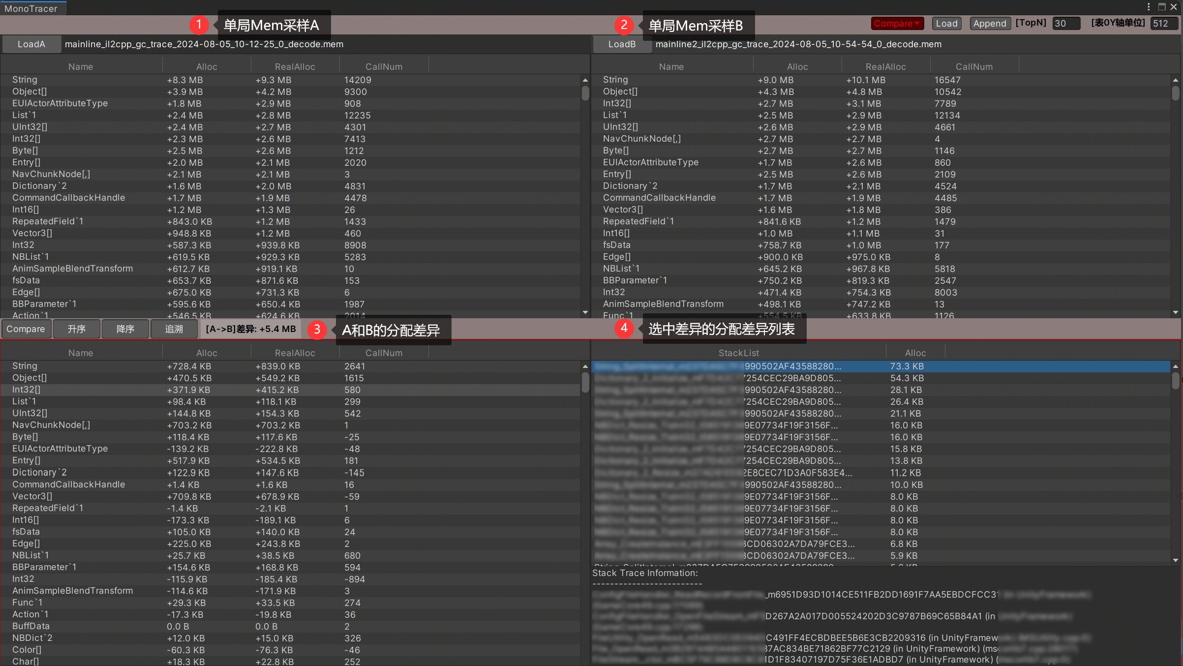 内存Trace我是自己做的工具,详细的做法和功能可以看这篇[Unity内存(三)内存追溯]。Trace解决的是Reserved内存过大的问题,方式是记录每次分配来源,因为有些对象确实释放了,但是因为过程中频繁分配,并且大量分配,我们需要追溯到这些分配才能定位到具体的分配代码位置。