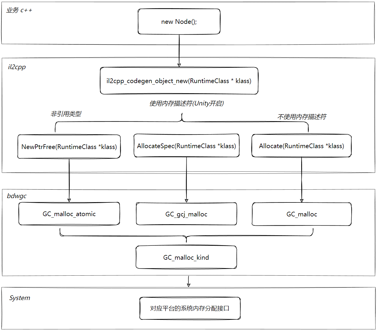 - Managed memory (托管内存):这部分内存是我们业务层C#代码使用的内存,IL2CPP之后虽然是C++代码,但是这部分内存任然是被托管的,被托管的内存自动分配和自动释放的。
