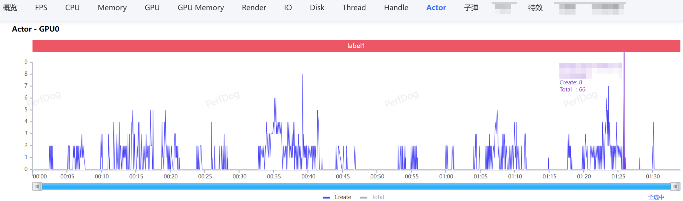 另外PerfDog提供了开放的API,可以采集数据的同时上传自定义业务性能指标数据(当前帧创建怪物数量、创建的特效数量等等),这个对分析问题非常有帮助。当PerfDog采集出来的数据,某一帧存在严重卡顿,如果我们有采集自定义业务性能指标,那我们就可以直接根据卡顿点,关联到业务的性能指标了。举个例子:PerfDog显示采集的数据中第n帧卡顿,我们直接可以看到这一帧业务中的Actor的创建数量和总数量: