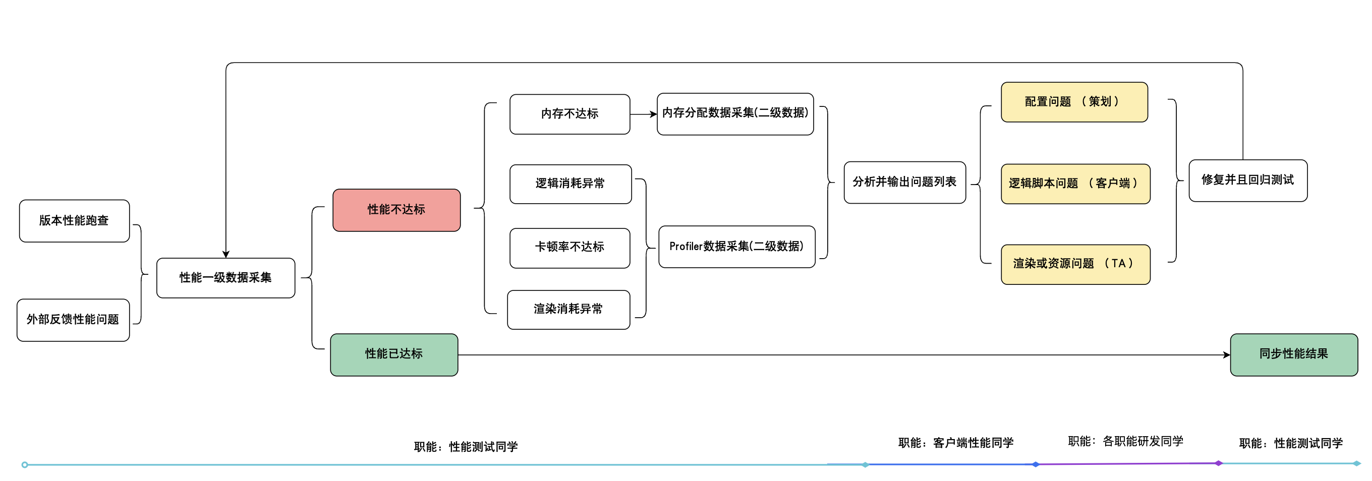 b. 性能同学只负责完善数据采集,完善问题分析工作管线以及引擎侧性能。具体模块的性能给到具体业务模块的负责人,那么模块负责人就是自己模块性能的owner,性能好坏就是你的KPI。当版本模块耗时统计数据出来之后,每个模块负责人关注自己模块是否存在性能问题,需要做二级数据分析的,自己分析,PM或者技术负责人整合推动性能进度,定期同步当前性能情况和问题处理情况。