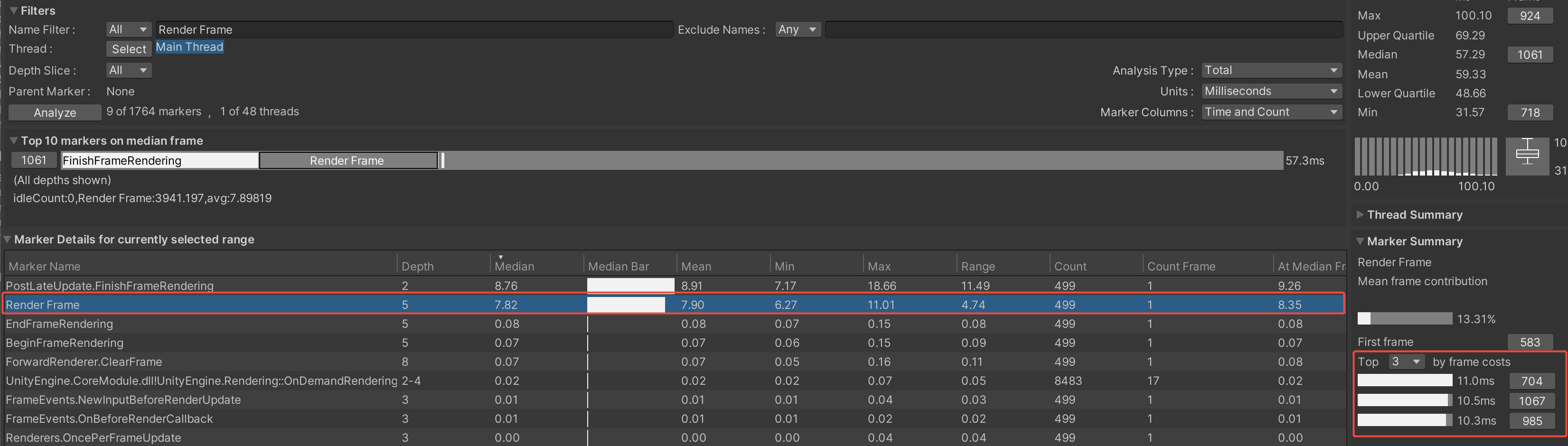 这里解释下我指代的关键模块,比如引擎相关的 Rendering.RenderFrame、Rendering.Submit、EventSystem.RaycastAll等,业务层的 子弹模块根部的Tick、技能Timeline模块根部Tick、加载模块的根据Tick等,耗时我们可以通过 Time.realtimeSinceStartup 的时间,然后记录函数调用开始和结束的时间差来统计,引擎里面的模块函数统计可以通过 PlayerLoopSystem 处理,可以在PlayerLoopSystem的subSystemList中插入自己的统计updateDelegate,具体的做法可以参考这篇文档。有了这些数据,我们可以通过和基准数据对比,看哪部分上涨了,就可以分析出来CPU耗时上涨的大概原因了。形式大概如下: